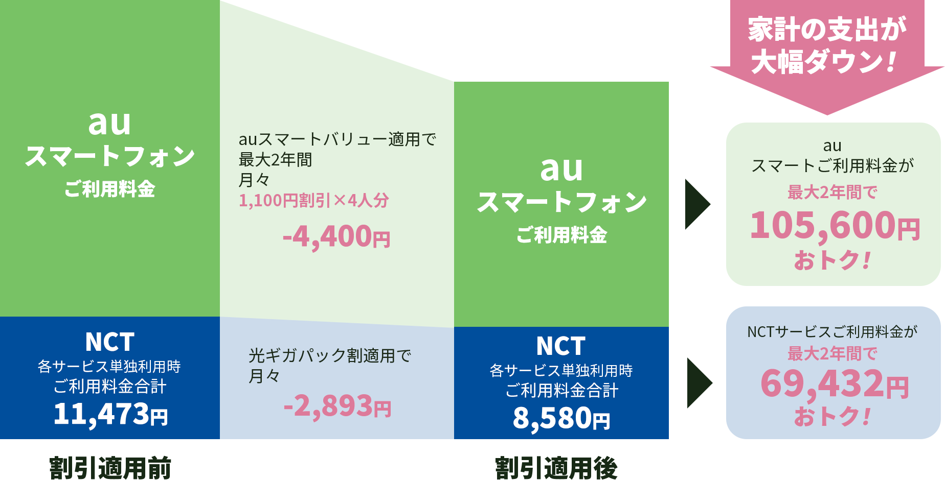 ・NCTのサービスを提供会社側都合で取消された場合は、取消月の翌月から3ヶ月目まで割引します。ただし、開通前にお客さま都合により取消された場合は、受付の前月利用分をもって割引を終了し、それまでの割引額をau携帯電話(タブレット含む)側のご利用料金に合算し請求します。