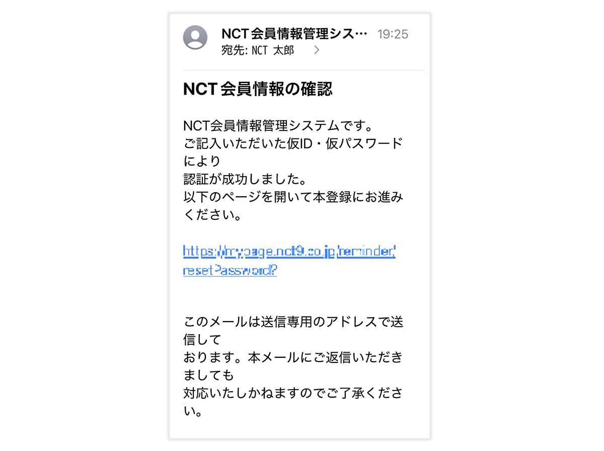 また、迷惑メール対策の設定をされている場合は削除いただくか、My NCTからのメール(@mypage.nct9.ne.jp)を受信できるよう設定変更をお願いします。 - 登録済か確認したい