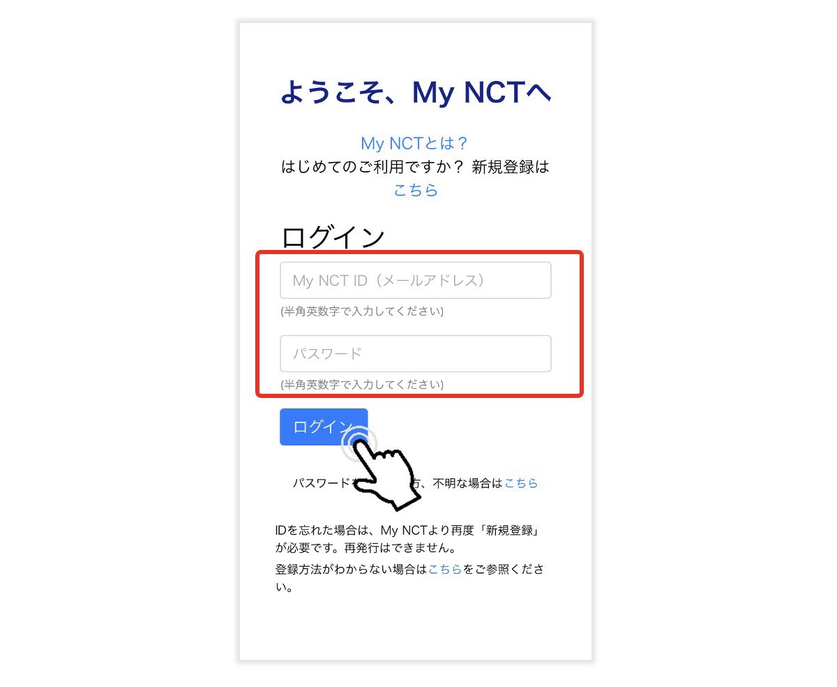 パスワードをお忘れの方、不明な場合はこちらからパスワードの再登録をお願いします。 - My NCT ID(メールアドレス)がわからない