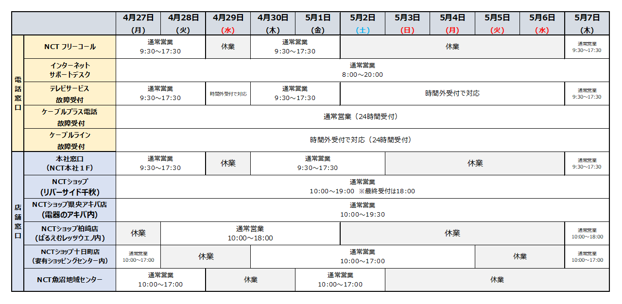 5月2日(土)~5月6日(水)の期間中は、全て休日電話受付窓口での対応となります。