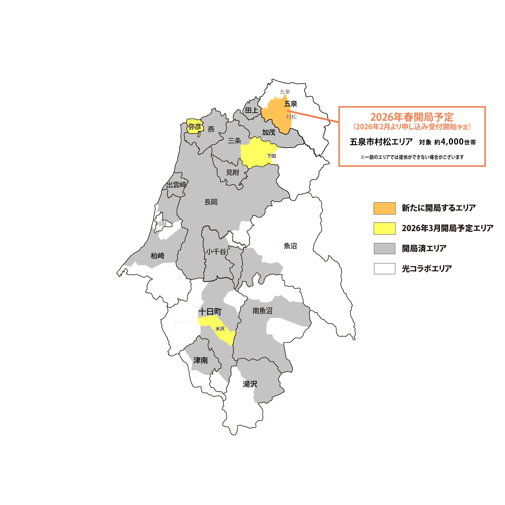 ■長岡市 ■三条市 ■見附市 ■小千谷市 ■燕市 ■柏崎市 ■加茂市 ■田上町 ■魚沼市 ■南魚沼市 ■出雲崎町 ■十日町市 ■湯沢町 ■津南町