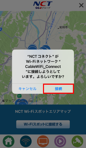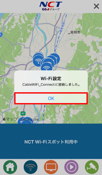 ⑤利用中の場合、画面下部に「NCT Wi-Fiスポット利用中」と表示されます。